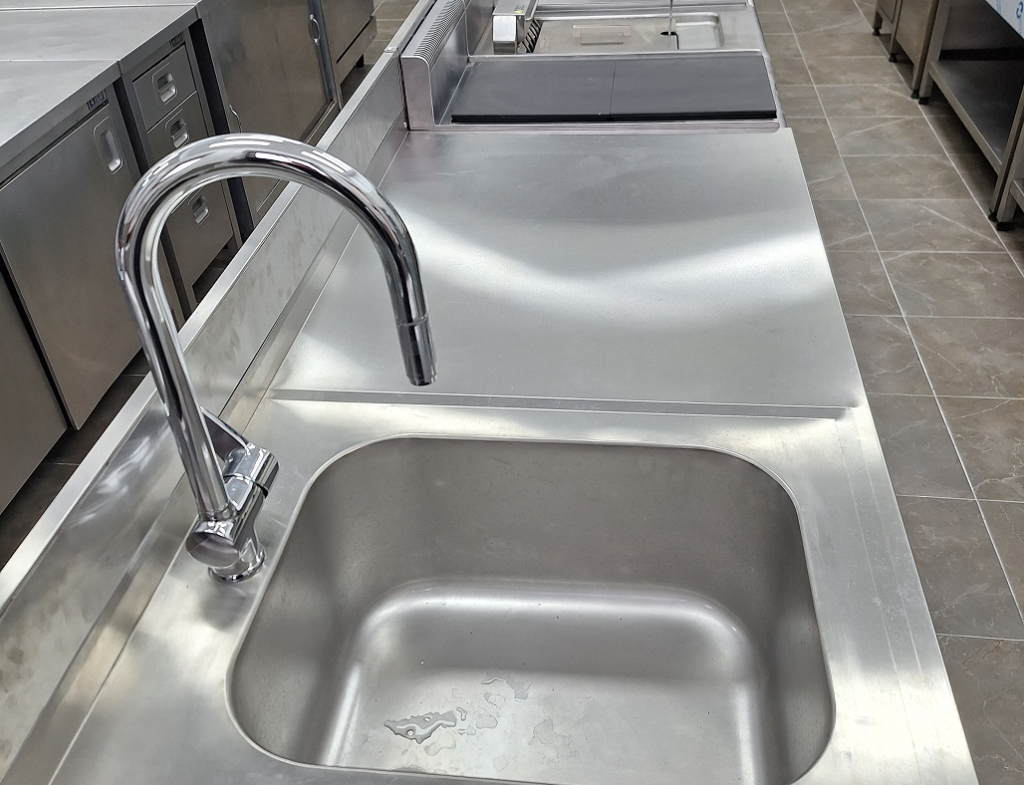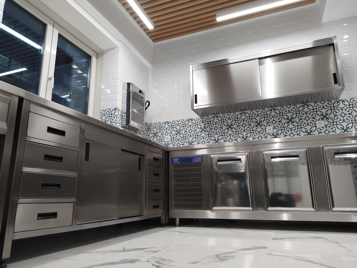 Neutralna oprema poput radnih stolova, ormarića, sudopera i polica, dizajniranu za organizaciju i funkcionalnost u profesionalnim kuhinjama.